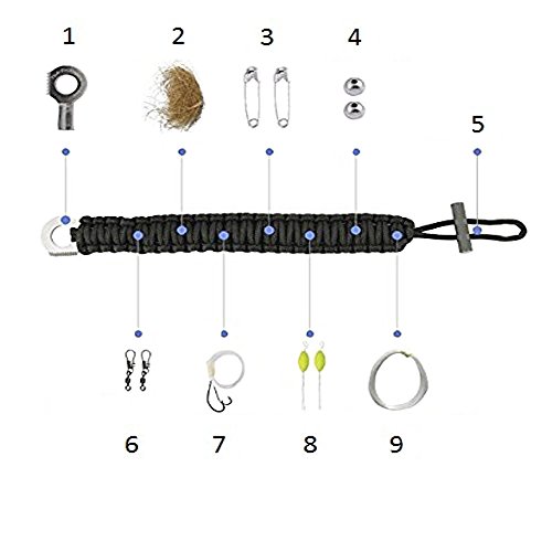 - 9 Useful Accessories Include:Despite the slim design, this bracelet contains 9 different accessories for the ultimate in preparedness; Tinder, Safety pins, Eye knife, Fire starter, Weights, Swivels, Fishing hooks, Floats, Fishing lines.an emergency survival equipment that you must have for hiking, trekking , camping and emergency situations.