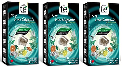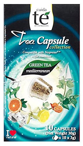 -. Binding : Misc. -. Brand : Cuida Tea -. EAN : 0616453977549 -. Feature : 30 Nespresso Compatible Pods,Mediterranean Green Tea for flavorful instant hot tea experience / Compatible with all Nespresso machines (including Citiz, U, Pixie, Inissia, Essenza and Lattissima) / A high quality and economical alternative to Nespresso capsules. Produces a flavorful cup of Mediterranean Green tea / Fully compatible, 3 boxes of sealed pods packaged in sealed poly bag packaging / Fine teas blended to produce a refreshing and healthful cup of Mediterranean Green tea with a slight citrus infusion -. IsAdultProduct : 0 -. Label : Nespresso4Less -. LegalDisclaimer : Nespresso(r) is a registered trademark of Societe' Des Produits Nestle S.A.. Origen Coffee and Nespresso4Less are independent producers and distributors not connected, either directly nor indirectly to Societe' Des Produits Nestle' S.A. -. Manufacturer : Nespresso4Less -. PackageQuantity : 30 -. ProductGroup : Grocery -. ProductTypeName : GROCERY -. Publisher : Nespresso4Less -. Studio : Nespresso4Less -. Title : 30 Nespresso Compatible Pods - Mediterranean Green Tea, 3 Boxes - 10 Pods per box -. UPC : 616453977549