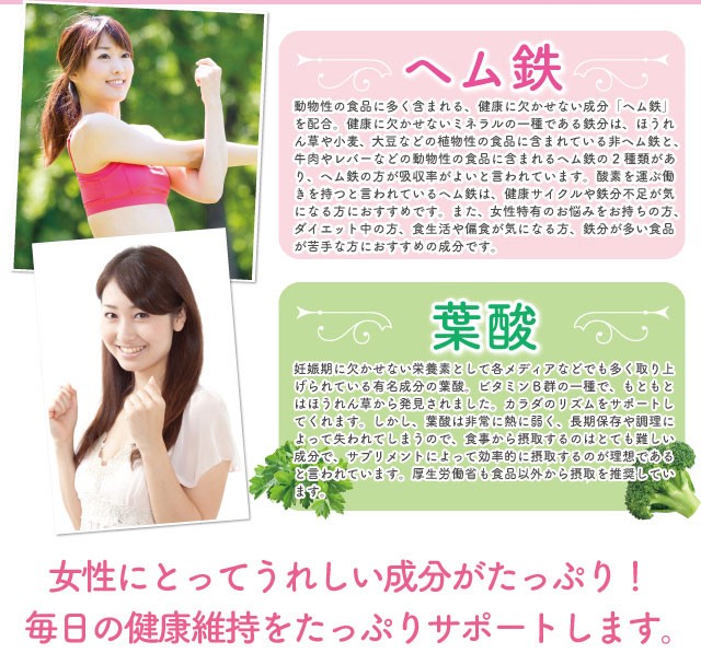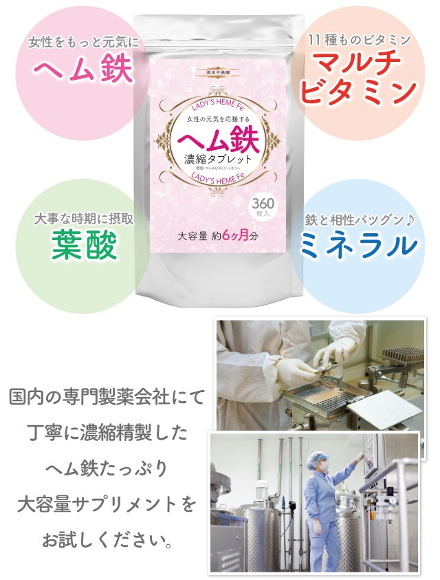 | 商品説明 | 女性のサポート成分として有名なヘム鉄を、専門の大手製薬会社にてたっぷりと濃縮配合! 「葉酸」「マルチビタミン」「ミネラル」も配合! 製薬会社が独自開発した配合比率にて濃縮! |