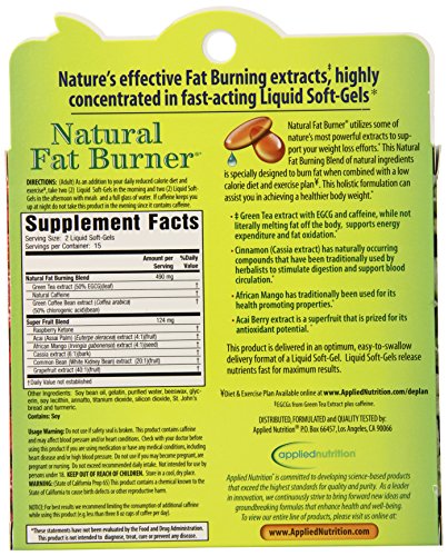 -. Binding : Health and Beauty -. Brand : Applied Nutrition -. EAN : 0710363568443 -. Feature : It includes 3 boxes / EGCGs combined with natural caffeine produce energy expenditure and fat oxidation / Pomegranate juice has been shown to have potent antioxidant activity that protects nitric acid against oxidative destruction in a low as 1 mcg. / In addition to urinary health, cranberry has traditionally been used as a diuretic. / Blueberry, a super antioxidant, can support water weight management by assisting in the replacement of potassium in the body. / Cinnamon & grapefruit may support metabolism while assisting in sugar support. -. IsAdultProduct : 0 -. Label : Applied Nutrition -. Manufacturer : Applied Nutrition -. Model : Applied Nutrition -. MPN : 22368(3) -. NumberOfItems : 1 -. PackageQuantity : 3 -. PartNumber : 22368(3) -. ProductGroup : Health and Beauty -. ProductTypeName : HEALTH_PERSONAL_CARE -. Publisher : Applied Nutrition -. ReleaseDate : 2015-07-16 -. Size : 30 Liquid Soft-Gels (Pack of 3) -. Studio : Applied Nutrition -. Title : Applied Nutrition Natural Fat Burner, 30 Liquid Soft-Gels (Pack of 3) -. UPC : 783318898629