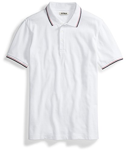 -. Feature : An Amazon brand / Washed pique polo shirt featuring three-button placket and contrast stripe trim at collar and cuffs / Straight hem / Model is 6'2" and wearing a size M / Our fit is comparable to polo shirts from J.Crew and Banana Republic
