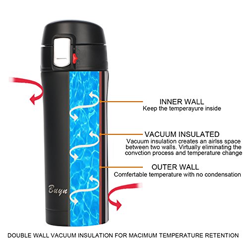 When it comes to so-called leakproof travel mugs, There's nothing worse than heading into a meeting with coffee stains all over your shirt! But with the BUYNEED insulated travel coffee mug, leaks are a distant memory. The unique vertical safety lock on the lid seals in your liquid securely to prevent leaks and accidental spills. Thanks to innovative vacuum insulation technology, air is sucked out tocreate a vacuum between the double walls, minimizing the effect of outside temperature. Your coffee or tea stays piping hot, fresh, and delicious for up to 6 hours and cold drinks stay chilled. thermos food jar