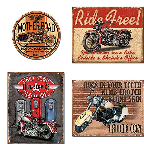 Motorcycle Tin Sign Bundle - Mother Road Motorcycle Repair, Ride Free, Last Stop Full Service Gasoline, Ride On