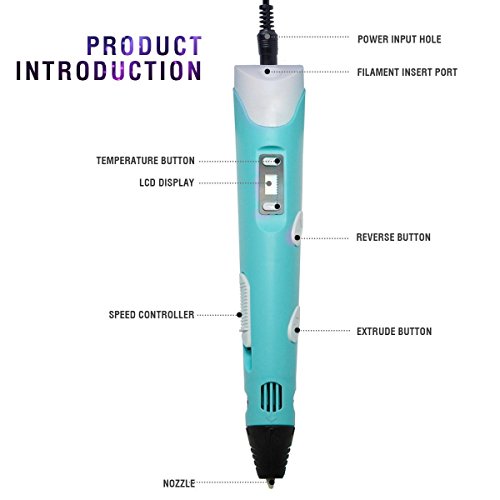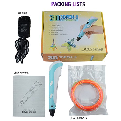 Package Includes: -1x Blue 2nd Generation 3D Printing Pen -1x 110-240V Power Adapter -3x 1.75mm PLA Filament with random colors -1x Operation instruction booklet
