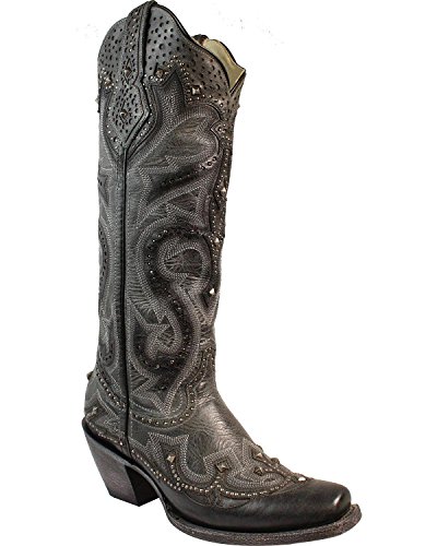 Studio : Corral Publisher : Corral Binding : Apparel Product Description Match a new pair of Corral boots to your favorite skirt or dress for a trendy, fashionable outfit. These boots are handcrafted with leather, have a laser cut out design, black embroidery throughout, and stud details. These boots are flashy, stylish, and will look great with any dress or skirt in your closet. Be the star of the show when you wear these beautifully unique cowgirl boots from Corral. 0