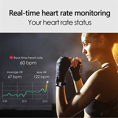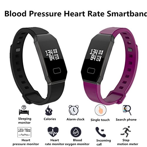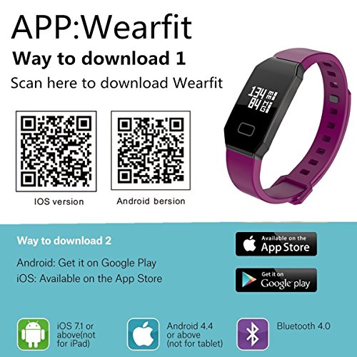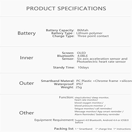 Model : A1 Waterproof: IP67 Strong waterproof can wear under cold water bath Sensor:MPU6500 Heart Rate/ Blood Pressure Chip: PAH8001EI Vibration: "Mute / vibration " Compatibility System: Android 4.4 and above,iOS 8.0 and and above LCD display :0.66inch OLED Host Size:47.6*16*12.6 mm Band Size:108.5*109*13 mm Bluetooth: 4.0BLE Battery Type: Polymer lithium battery Battery Capacity: 86mAh Charging Time : about 1.5hour Using time:about 7 days Data Save Time: 23 days Operation Mode: Single touch、App control(can on/off) Language :Chinese / English and other 12 languages Strap Material :TPU Color: Black, Blue、Purple App name : WearFit Functions :