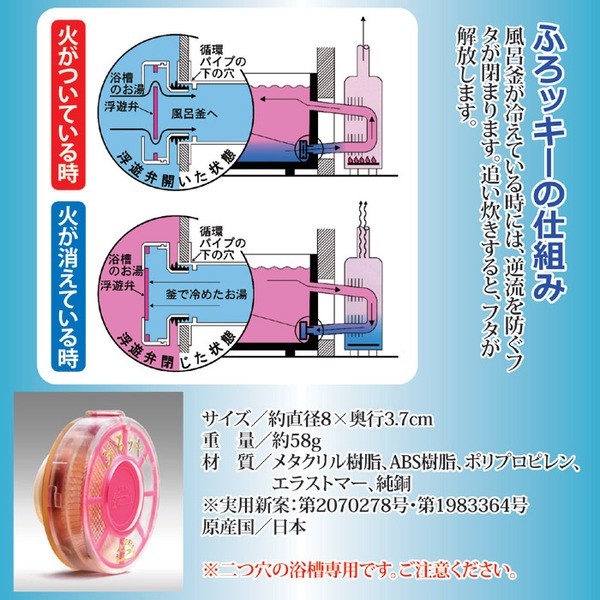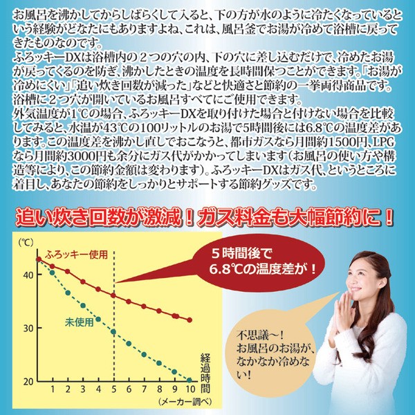 ふろッキーは浴槽内の2つの穴の内、下の穴に差し込むだけで、冷めたお湯が戻ってくるのを防ぎ、沸かしたときの温度を長時間保つことができます。
