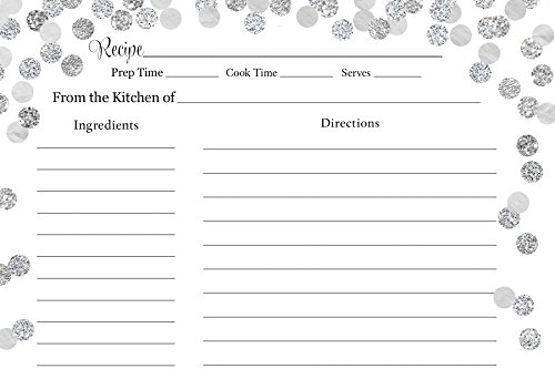 Recipe Cards, Double Sided with Lines, Size 4 x 6, Confetti, Silver, Bridal Shower, Champagne Brunch, Wedding, Housewarming, Gift, Glitter, Sparkle, Brunch and Bubbly, Set of 24 Printed Cards
