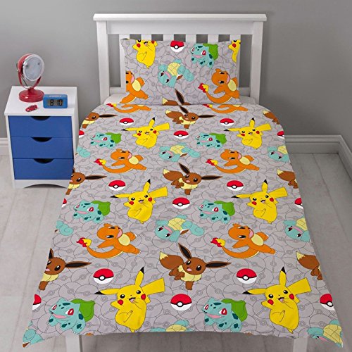 Studio : Character World Publisher : Character World Product Description ?100% official merchandise ?Features favourites Pikachu, Squirtle, Bulbasaur, Eevee Charmander ?Reversible - 2 designs in 1 ?Duvet cover size approx: 135cm x 200cm ?Pillowcase size approx: 50cm x 75cm ?Material: 100% microfibre ?Machine washable ?Colour: Multi ?Please note: comforter and pillow not included Pokemon fans will love this fun Pokemon Catch Single Duvet Cover Set. The front of the duvet cover features Pokemon favourites Pikachu, Squirtle, Bulbasaur, Eevee Charmander in different poses on a grey background, whilst the reverse has repeated images in a smaller design. This duvet cover can be machine washed and tumble dried on a cool setting. 0