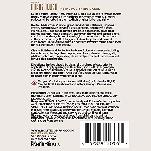 ReleaseDate : 2017-09-20 Studio : Rolite Company Publisher : Rolite Company Binding : Misc. Product Description Rolite' s Midas Touch works great on: Antiques, flatware, trophies, jewelry, sterling silver, serving pieces, planters, decorative pieces, stainless steel, copper cookware, fireplace accessories, brass door fittings and trim, range drip pans, aluminum shower and screen doors, stainless steel sinks, chrome faucets, glass shower doors, brass beds, cutlery, ornaments, golf clubs, guns, knives, bicycles and musical instruments This exclusive formula contains jeweler's rouge and is ideal for ALL metals and fine jewelry Not recommended for use on plated metals Directions: Surface should be clean, dry and free of dust prior to application Apply sparingly with a clean, soft cloth Rub gently in circular motions until black residue appears Buff off residue with a clean, dry microfiber cloth After polishing food contact items, wash polished item in soapy water prior to use. Brings out the maximum luster a mirror like finish in jewelry. 0