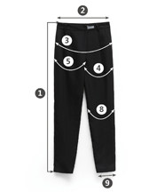| 尺码 | ①裤长 | ②腰围 | ③臀围 | ④左腿围 | ⑤右退围 | ⑥前裆 | ⑦后裆 | ⑧膝围 | ⑨脚围 | ||