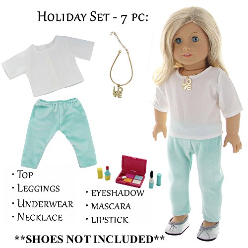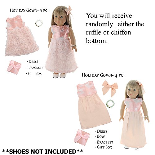 This set includes four outfits & accessories (18 pcs.).- HOLIDAY GOWN: Beautiful gown with sleek chiffon bottom/ or ruffle bottom, Bow, Bracelet, Giftbox.