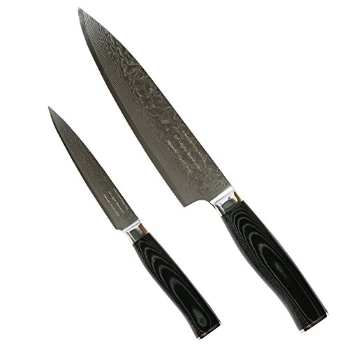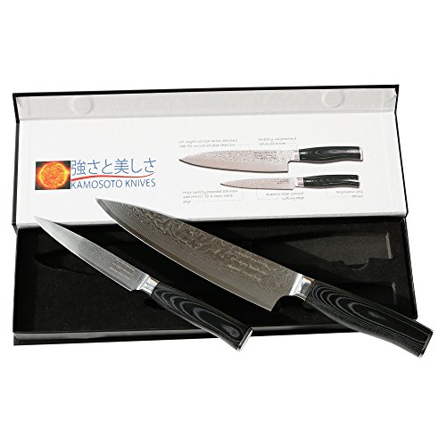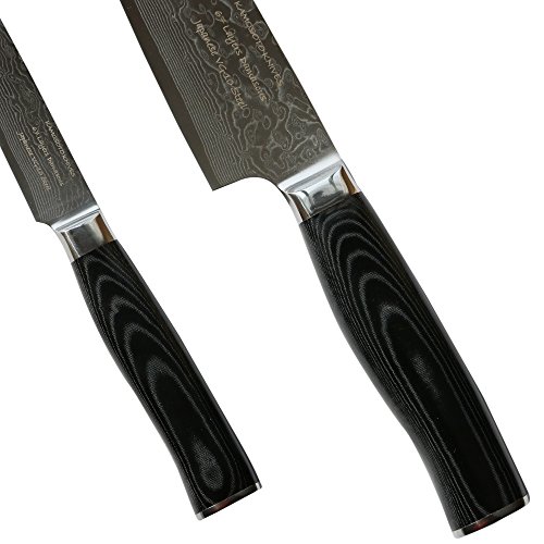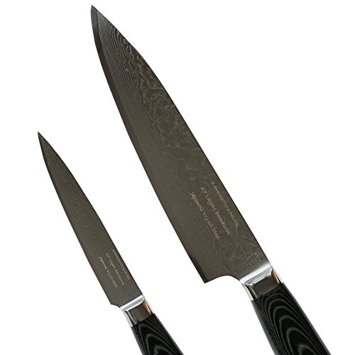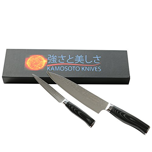 Set of Professional Damascus 8-inch Chef and 5-inch Utility Knives by Kamosoto, Japanese 67 Layers VG-10 Damascus Stainless Steel, Micarta Handle and Beautiful Tiny Wave Blade Pattern, KAM5204