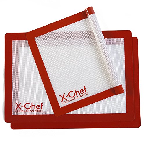X Chef 16.5 * 11.6 inch Silicone Baking Sheets 3-pack The X Chef Silicone Baking Mat is the Solution for all of your Baking Needs. With its Silicone coated fiberglass design food slides off of the Mat leaving No Burnt or residue for Better Results & Easier Cleaning. Produced using FDA (USA) and LFGB (Europe) approved materials, these are oven,dishwasher and freezer safe. Mats clean up easily with soapy water and allow to air dry. Mats are also dishwasher approved for top rack only. The mats will not absorb food odors or flavors and are perfect for the avid baker or the seasonal holiday cook. No cooking sprays, oils or parchment paper needed, helping you save both calories and money. These will quickly become your new favorite kitchen gadget.