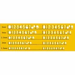 -. Feature : 文字高:5mm・4mm・3.5mm・3mm・2.5mm / 使用シャープ芯:0.5mm / サイズ:縦60×横140×厚さ0.6mm / 材質:ブチレート