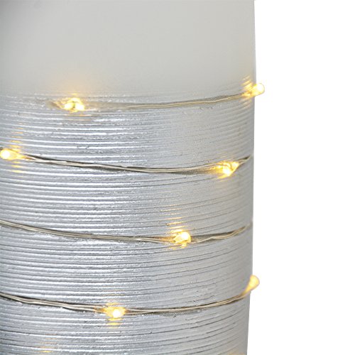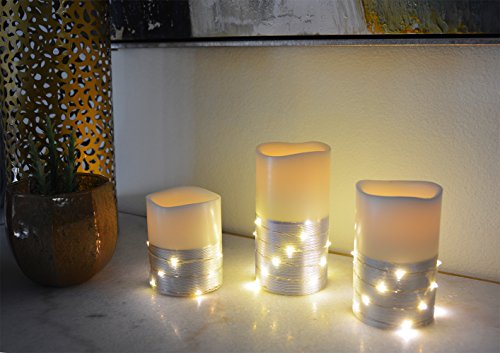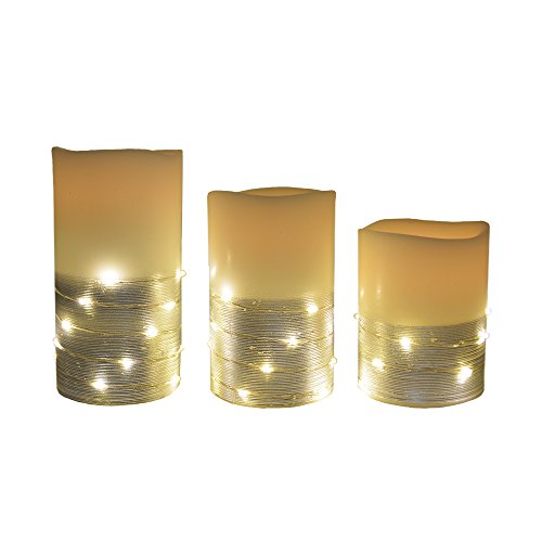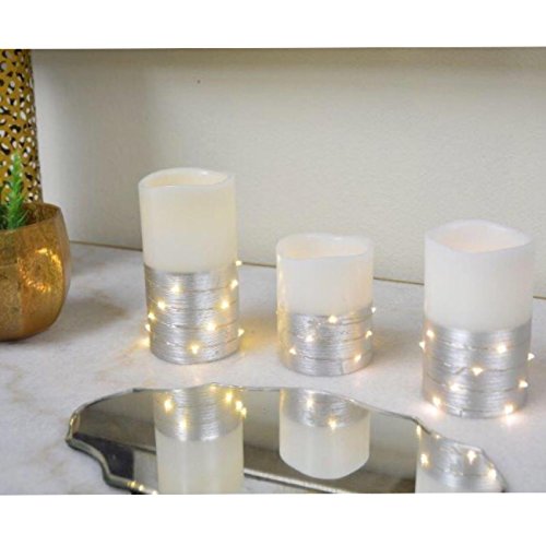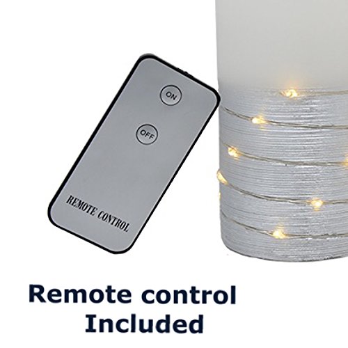 Studio : The Nifty Nook Publisher : The Nifty Nook Binding : Kitchen Product Description ENCHANTING Flameless LED Real Wax Pillar Candles with Remote Control - Set of 3. STUNNING Silver Color Banding with string of white led lights wrapped around pillar candle base for an elegant and stunning lighting effect in addition to the primary flameless candle LED light. 3 Heights Include: (Height: 6"H, 5"H, 4"H). ENERGY SAVING, POWERFUL LEDS: This Flameless Candle Set comes with 3 non flickering flameless real wax pillar candles, remote control x 1. Remote Instructions x1. Each flameless pillar candle is operated by (3) AAA batteries (not included). SAFETY COMES FIRST: These flameless candles can be used without having to worry of flame. With amazing flameless candle set you can have perfect ambient evenings with peace of mind. EASY AND CONVENIENT: Features ON and OFF switch on bottom of each flameless pillar candle. Includes Remote control that turns flameless candles ON and OFF. Remote Control will work up to a range of 20 feet. Remote control requires (1) Lithium CR2025 battery (not included). PERFECT FOR DECORATING: Perfect decoration to light up Birthdays, Home decorations, Holidays, Wedding, or other occasions. Adds Sparkle and ambiance to any home decor or event. Color: White Ivory. Dimensions: Large: 3"L x 3"W x 6"H, Medium: 3"L x 3"W x 5"H, Small: 3"L x 3"W x 4"H. Sold exclusively by The Nifty Nook. The perfect gift for family and friends. 0