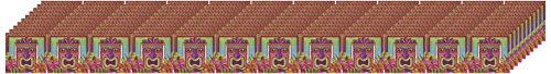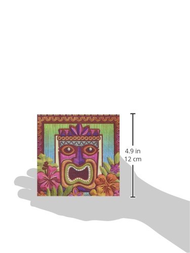 Features a colorful tiki pole in the center, an assortment of hibiscus flowers on the bottom corners, all against a bright blue and green gradient background with a brown wood carving design border.