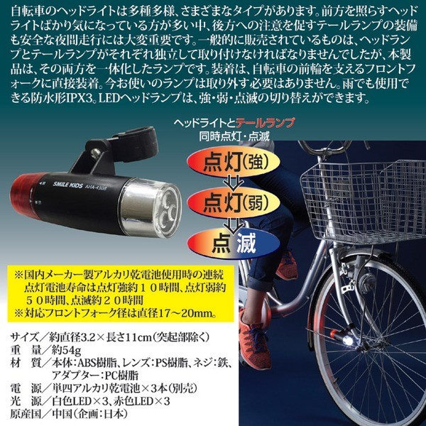 自転車のヘッドライトは多種多様、さまざまなタイプがあります。前方を照らすヘッドライトばかり気になっている方が多い中、後方への注意を促すテールランプの装備も安全な夜間走行には大変重要です。一般的に販売されているものは、ヘッドランプとテールランプがそれぞれ独立して取り付けなければなりませんでしたが、本製品は、その両方を一体化したランプです。装着は、自転車の前輪を支えるフロントフォークに直接装着。今お使いのランプは取り外す必要はありません。雨でも使用できる防水形IPX3。LEDヘッドランプは、強・弱・点滅の切り替えができます。