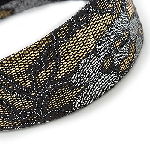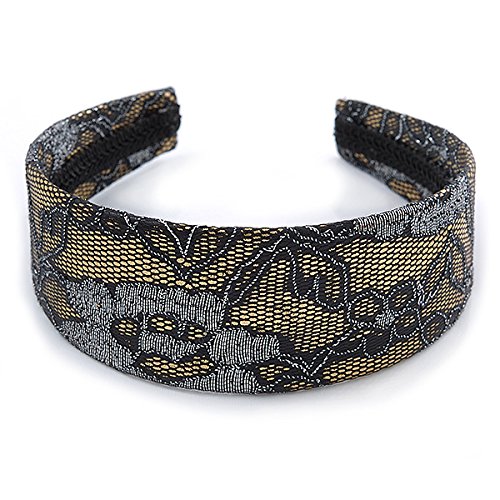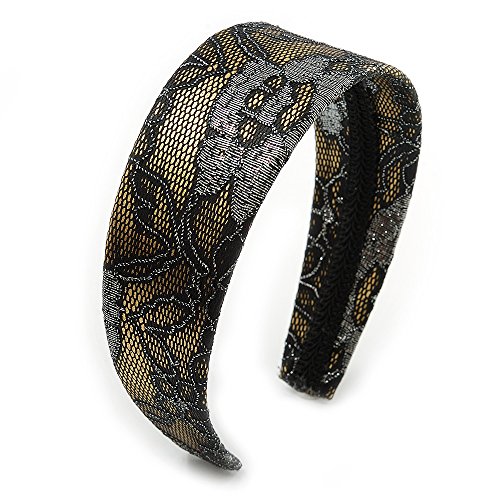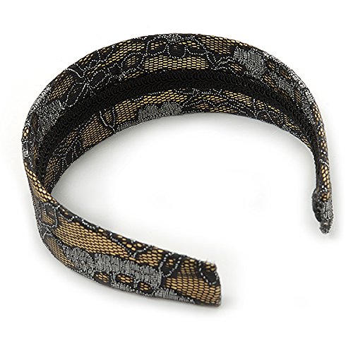 Studio : Avalaya Publisher : Avalaya Binding : Jewelry Product Description Complete your look in style with this Wide Black/ Silver Lace with Gold Acrylic Base Alice/ Hair Band/ HeadBand. Featuring a wide headband, made of gold coloured flex plastic and decorated with black and silver lace detailing.The band has about 14cm Diameter and 50mm W (at it's widest point). Style this band with party wear and day wear for subtle glamour. 0