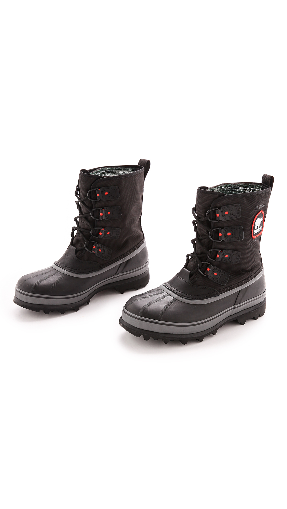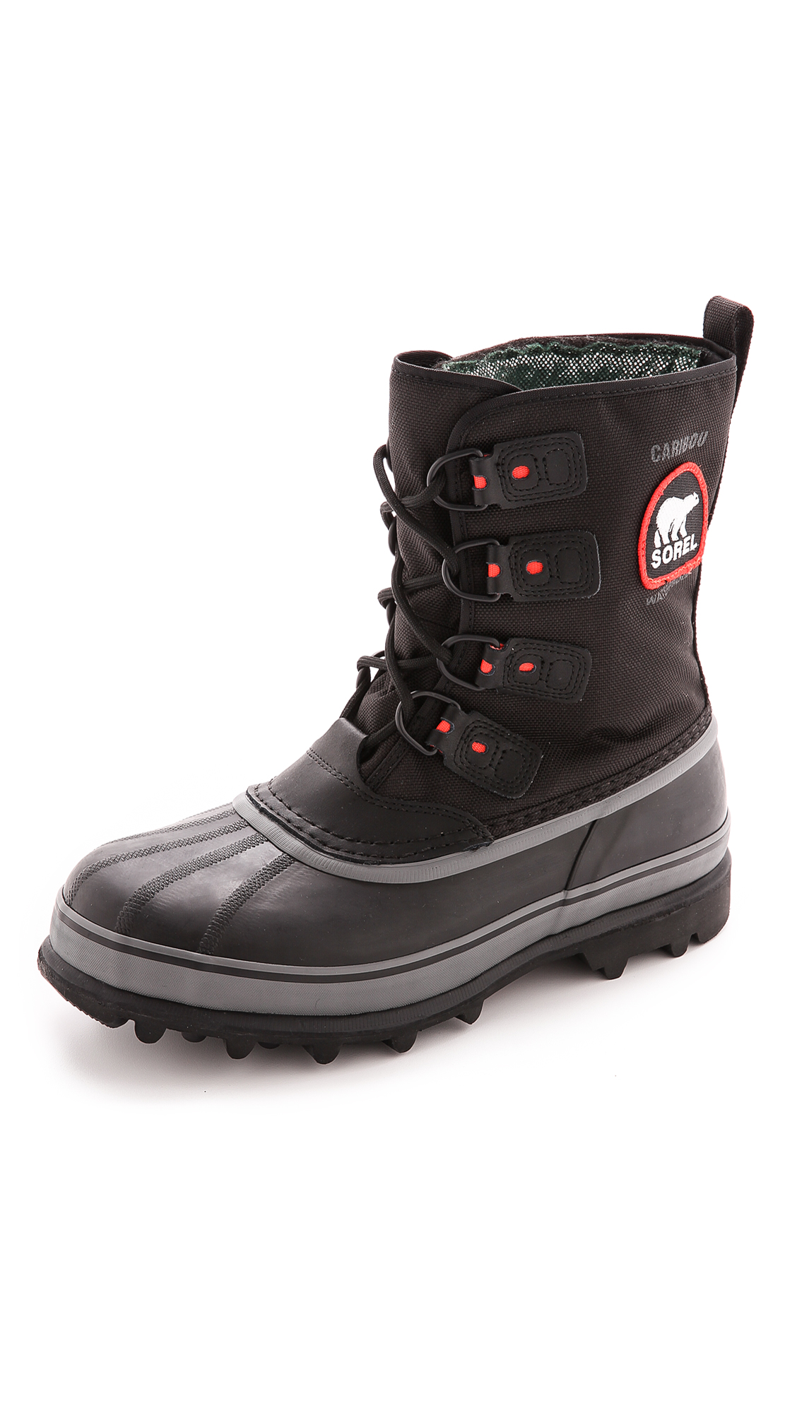 These Caribou XT boots update a classic Sorel silhouette. The rubber footing is topped by a rugged nylon upper with leather trim. Omni-Heat™ liner. Branded patch. Aero-trac sole.