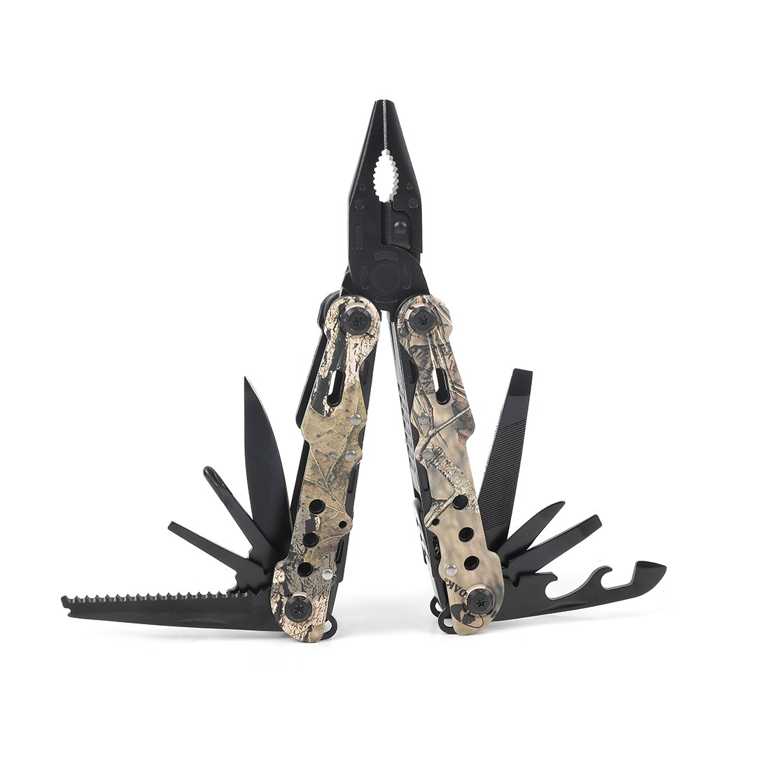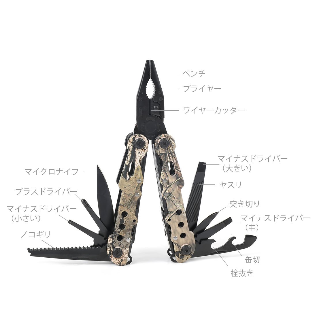 Multi Tool Description: pliers / radio pliers / pliers / Phillips screwdriver / minus screwdriver / large screwdriver / bottle opener / piercing / can opener / wire cutter / wire stripper / saw blade / file