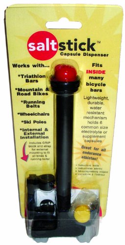 SaltStick Dispensers are designed to hide discreetly inside most mountain or triathlon style handlebars to deliver salt capsules or other supplements as needed during your ride. Includes a unique GRIP clip and strap and allows for mounting on hydration, race belts, or externally on bikes. Simply turn the front knob with one hand and out pops a capsule! Holds 6 size "0" or "00" capsules. Using SaltStick Caps at 1 to 2 per hour, a fully loaded SaltStick Dispenser will last 3-6 hrs. This unique, patented design is water resistant and will keep your capsules dry and prevents them from bouncing around during activity. SaltStick Dispensers are lightweight (Only 17g or 1/2 oz.) and made of food-grade plastic. Each package includes an extra color-coded nozzle for multiple supplement dispensing. SaltStick Dispensers have been used by top pros at Ironman Kona since 2005 and comply with USA Triathlon regulations.Feature