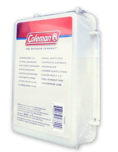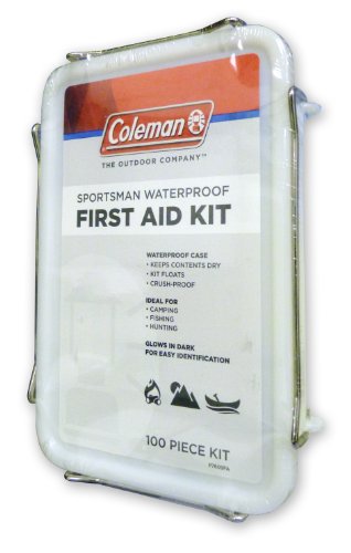 Studio : Coleman Repellents Publisher : Coleman Repellents Binding : Sports Product Description Campers, hikers, hunters, bikers, boaters, and other outdoor enthusiasts can rest easier with six first aid kit options available under the Coleman brand - the most trusted name in outdoor equipment. Each kit contains components that are most used and useful when you or your family needs medical attention away from home. Coleman’s Sportmans Waterproof First Aid Kit contains: 20 - Bandages 1" x 3", 20 - Small Bandages, 8 - Butterfly Bandages, 16 - Spot Bandages, 5 - Knuckle Bandages, 8 - Antiseptic Wipes, 4 - Sting relief Wipes, 2 - Large Safety Pins, 2 - Small Safety Pins, 4 - Antibiotic Ointments, 1 - Razor Blade, 2 - Rubber Gloves (1 pair), 6 - Gauze Pads 2" x 2", 1 - 1/2 x 2 1/2 Yards Adhesive Tape, 1 - Waterproof Case. 0