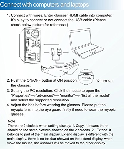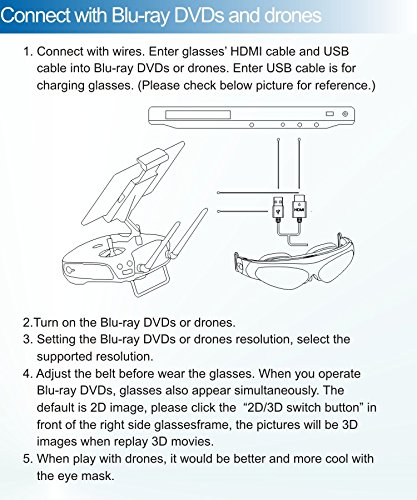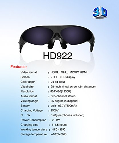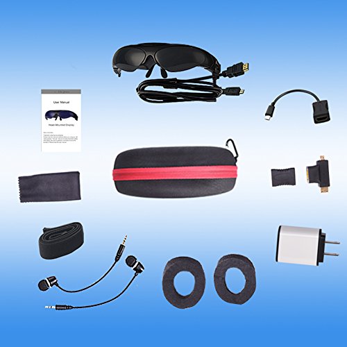 -. Feature : Enjoy 3D video on 98" big screen(at 2m distance) / Full HD Video Display / Display Screen : TFT LCD Micro Virtual Screen / support to connect all the devices with HDMI output interface and with MHL protocol Phones,such as Blu-ray DVD, Computer,photography equipment,Drones,iphone4/5/5s/6,Samsung etc. / 8MM stereo earphone MIC, with high performance ndfeb materials. In-ear design, the high-fidelity sound quality, and enough low volume, ensure to reduce the ambient noise / 3D/2D switch button, convenient to operate and durable. The fuselage integrated switch to adjust the volume.1.2M HDMI cable, support 5Gbps data transfer rate, easy to charge via USB interface / Handsome appearance , high density of engineering plastic composite, high elastic strap design, concise and easy, portable and durable.Defective unit can be replaced or refunded