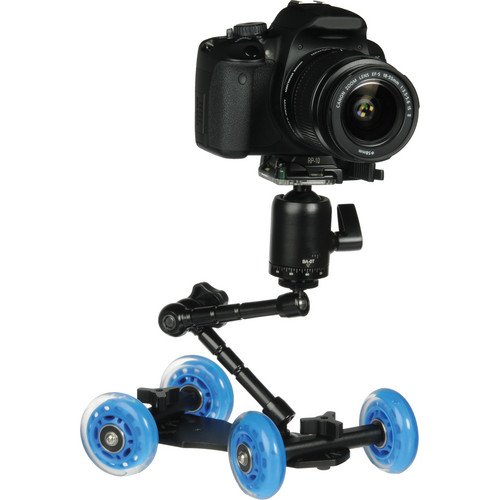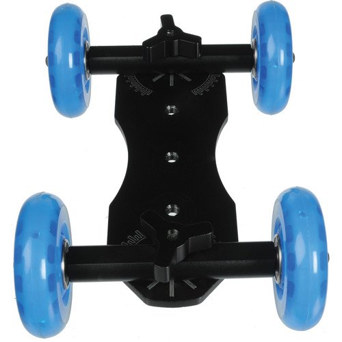 Key Features 4-wheel mini dolly for fluid motion shots in straight lines, curves, and wide circles Can be used tabletop or on any flat surface with a rig of up to 25 lbs Stainless steel ball bearings encased in 60mm solid rubber gel wheels enable smooth motion Scale markings allow aligning the wheel axels to desired matching positions A 1/4" screw is included for attaching a camera or ball head 1/4" threads allows mounting articulating arms with lights and mics