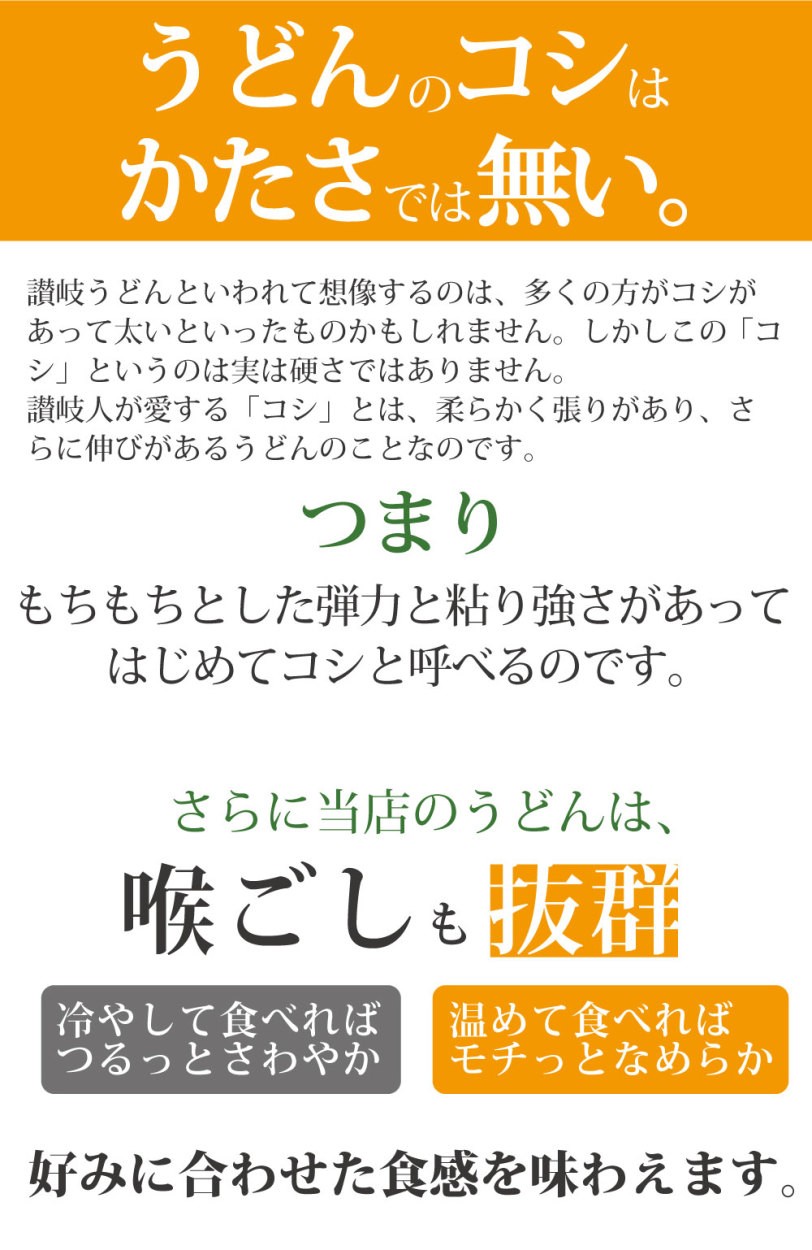 | 本場香川の名店も認めた讃岐うどんをぜひご堪能ください。 讃岐うどんは他のうどんとは違う、独特のコシが命です。茹で上がりから徐々にうどんの味は落ちていきますので、茹でた後、なるべく早く召し上がってください。かけうどんはもちろん、ぶっかけうどん、わかめうどん、きつねうどん、鍋焼きうどん、釜玉うどんそしてすき焼きや水炊きなどの鍋のシメにも一晩熟成讃岐うどんをどうぞ。 |