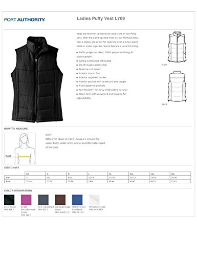 Studio : Port Authority Publisher : Port Authority Product Description design #: L709 Keep the warmth centered on your core in our Puffy Vest. With the same quilted lines as our Puffy Jackets these designs are great for layering over a long sleeve shirt or under a jacket. Some feature a colorful lining. 100% polyester shell 100% polyester lining 6-ounce polyfill Gently contoured silhouette Zip-through cadet collar Reverse coil zipper Interior storm flap Interior zippered pocket Interior pocket with drawcord and toggle Front zippered pockets Port Pocket for easy embroidery access Open hem with drawcord and toggles for adjustability 0