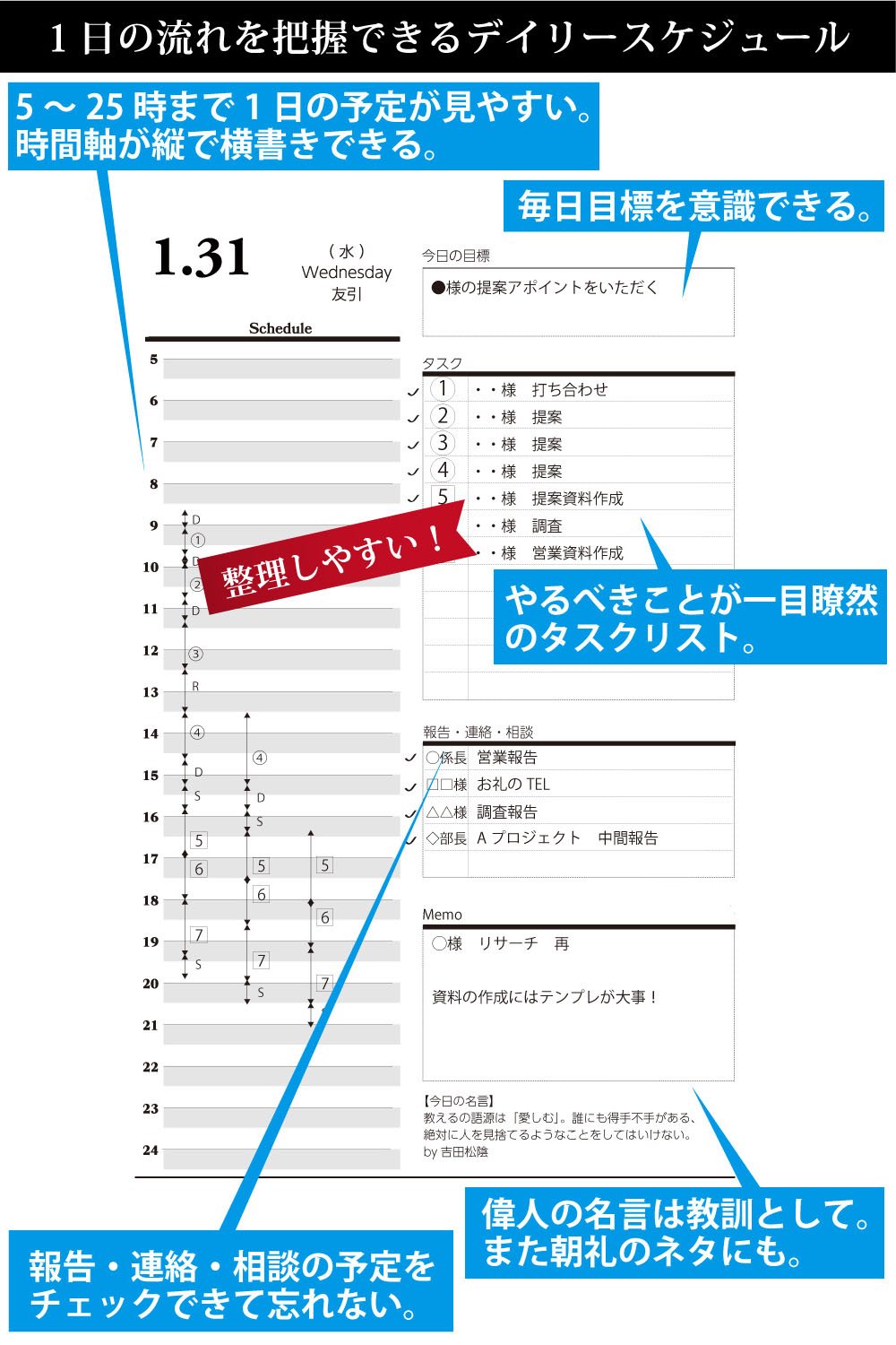 Schedule, execute, verify and improve Improve productivity of businessmen who are competing on the first day of the day and support rich life.