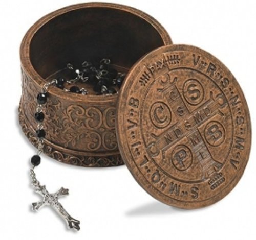 Saint St Benedict of Nursia Medal Lid Relic Keepsake 3 1/4 Inch Dia Bronzed Resin Rosary Box