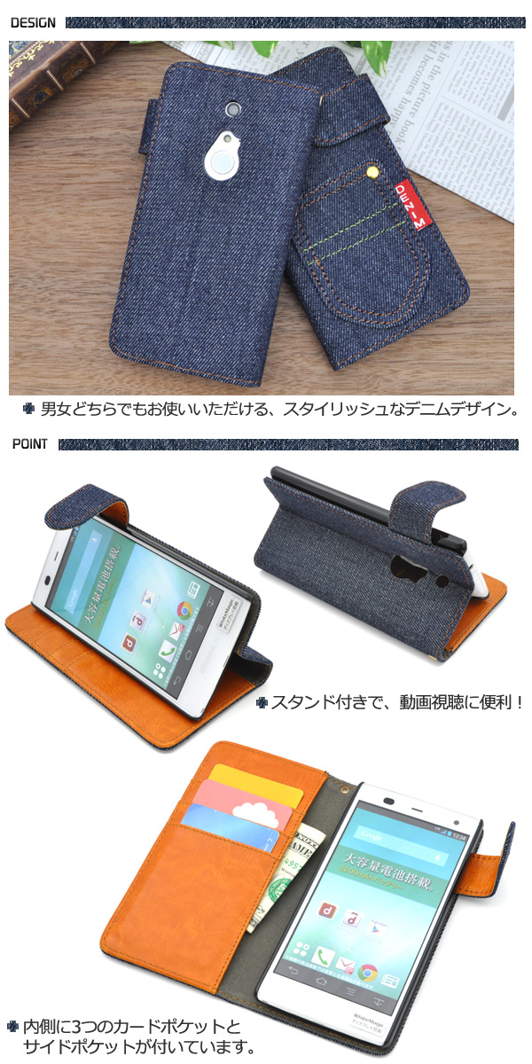 デニムデザインのARROWS NX F-01F用スタンドケースポーチ。