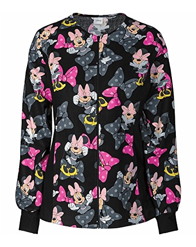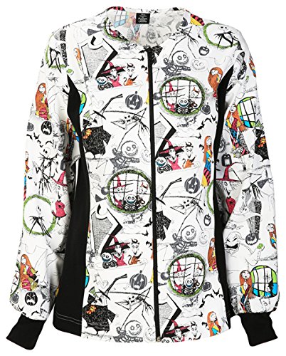 This modern classic fit flexible zip front jacket shapes and slims the body with its knit side panels. The knit cuffs, round neckline, and two front hidden pockets complete the picture. A tooniforms print is featured on this flexible silhouette. Center back length- 26 1/2 inchFeature