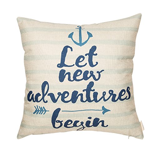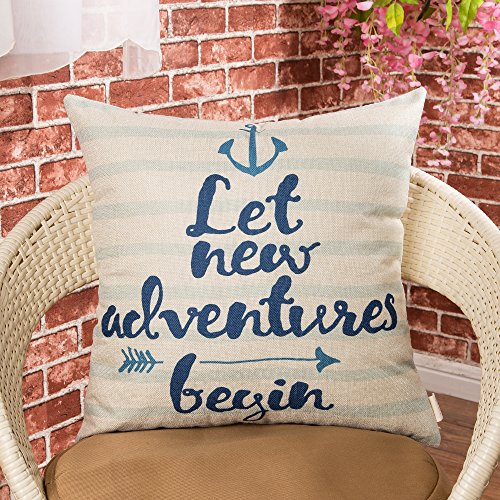 Fjfz Nautical Let New Adventures Begins with Anchor Arrow Inspirational Quote Cotton Linen Home Decorative Throw Pillow Case Cushion Cover with Words Sofa Couch, Light Blue Stripe, 18" x 18"