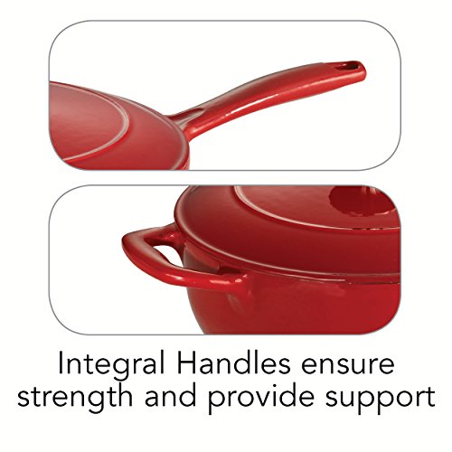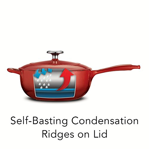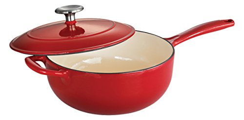The enameled cast-Iron 3 Qt covered saucier pan is part of Tramontina's Gourmet collection of premium products engineered and manufactured with the finest design, materials and workmanship, outperforming similar products within the market and delivering the best quality and value to the cooking professional and enthusiast alike. Prized by cooks for heat retention and even cooking, this enameled cast-iron 3 Qt covered saucier pan comes in a vibrant, gradated porcelain enamel exterior finish offering an elegant kitchen to table serving option. The self-basting condensation ridges on lid uniformly collect and direct vapors onto food, producing moist and savory dishes making the saucier a perfect vessel for slow heating to tenderize meats, poultry and vegetables or evenly reducing sauces. The heavy-gauge cast-iron covered sauce pan cooking surface is coated with off-white, smooth and easy-to-clean PFOA- and PTFE-free porcelain enamel and the sturdy side handles make handling a filled pan more manageable. Hand-wash only, compatible with all cooktops and oven-safe to 450 F. This product is assembled and packaged in USA and offered under a lifetime warranty.Feature