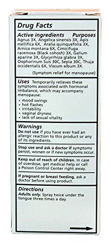 ReleaseDate : 2015-06-22 Studio : Liddell Homeopathic Publisher : Liddell Homeopathic Binding : Health and Beauty Product Description Liddell Homeopathic Menopause Spray Description: Mood Swings. Hot Flashes. Irritability. Vaginal Dryness. Lack of Sexual Vitality Liddell Menopause relieves menopausal symptoms: hormonal imbalance, emotional fluctuations, hot flashes and irritability. Free Of Animal testing. Disclaimer: These statements have not been evaluated by the FDA. These products are not intended to diagnose, treat, cure, or prevent any disease. 0