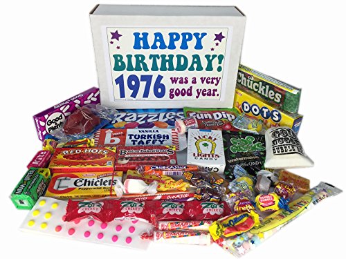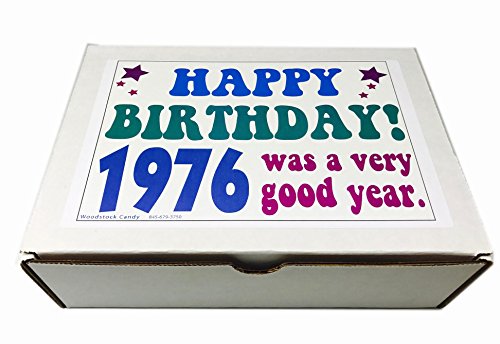 -. Binding : Grocery -. Brand : Woodstock Candy -. Feature : Contains 30 kinds of retro nostalgic candy / 1976 birthday gift box is filled with old time candy that will bring back great memories / Makes a fun and unique 40th birthday gift for any candy lover / Perfect gift for the person who has everything / Box measures 9.5 x 7 x 3 inches and comes shrink wrapped -. IsAdultProduct : 0 -. Label : Woodstock Candy -. Manufacturer : Woodstock Candy -. PackageQuantity : 1 -. ProductGroup : Grocery -. ProductTypeName : GROCERY -. Publisher : Woodstock Candy -. Studio : Woodstock Candy -. Title : 1976 41st Birthday Gift Box Retro Nostalgic Candy From Childhood - 41 Years Old - Jr