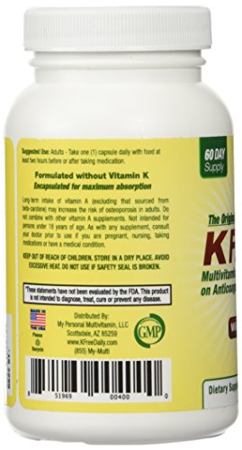 -. Binding : Health and Beauty -. Brand : K Free Daily -. EAN : 0851969004000 -. Feature : Safe to take with their anticoagulation medications. / Developed by a Pharmacist and a Registered Dietitian. / Two Months Supply. / No Vitamin K / Proudly made in the USA -. Label : K Free Daily -. Manufacturer : K Free Daily -. PackageQuantity : 1 -. ProductGroup : Health and Beauty -. ProductTypeName : HEALTH_PERSONAL_CARE -. Publisher : K Free Daily -. Size : 60 Capsules -. Studio : K Free Daily -. Title : Multivitamin - No Vitamin K - Safe for People on Blood Thinners - 60 Vegetable Capsules (Two Months Supply) -. UPC : 851969004000