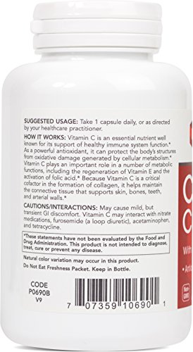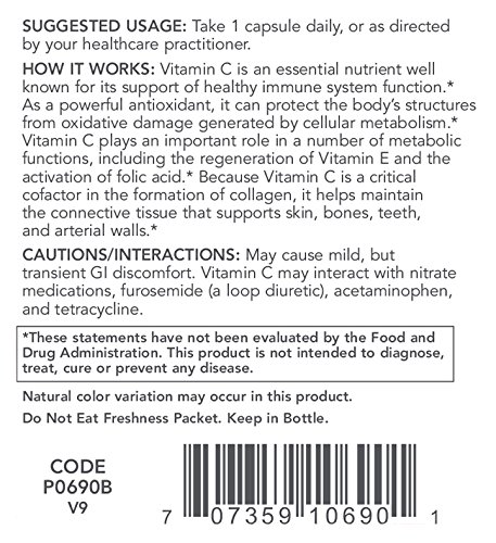HOW IT WORKS: Vitamin C is a water soluble nutrient well known for its vital role in immune system function. Vitamin C is necessary for the production of collagen (a structural protein in connective tissue) and is therefore important for skin, bone, and joint health.* Vitamin C is needed for amino acid metabolism and the utilization of many nutrients, such as folic acid and iron.* Vitamin C is also a highly effective antioxidant that can protect the body's cells and molecules from damage by free radicals and reactive oxygen species that can be generated during normal metabolism, as well as through exposure to environmental toxins and pollutants.* In addition, Vitamin C is important for the regeneration of other antioxidants such as Vitamin E.* Natural color variations may occur in this product.Feature