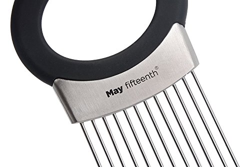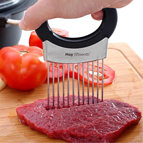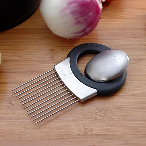 - Onion Holder Slicer- It features unique stainless steel prongs that allow you to hold & slice onion,tomatoes,potatoes,carrorts,cucumbers & even hard boiled eggs hands-free ,and the handle has large confortable oval,no-slip designed to precent cuts & scrapes.