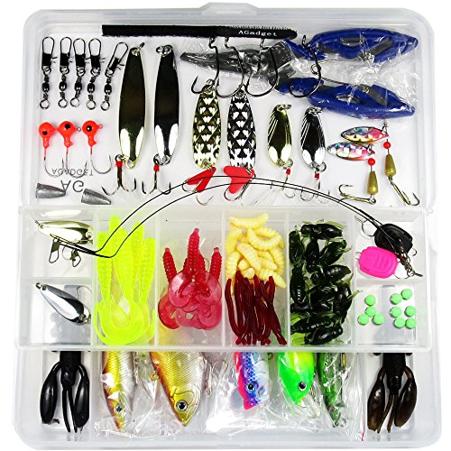 -. Feature : This Fishing Lure Kit is Mixed Lots,including Hard Plastic Lures,Soft Silicone Lures,Stainless Steel Pliers,Stainless Steel Rings,Sharp Hooks and others totally 101PCS. / Hard Plastic Lures 5PCS,they are 1PC Minnow,1PC Popper,1PC Pencil,1PC Crankbaits,1PC VIB. / Soft Silicone Lures 46PCS,they are 24PCS Worms,10PCS Earthworms,10PCS Crickets,2PCS Shrimp. / Metal Spoons 10PCS,from 3g to 11g. Other Fishing Accessories 39PCS,they are Stainless Steel Pliers,Stainless Steel Rings,Sharp Hooks,Bullets,Jig Head,Line Stopper,Clips and others. / 1PCS Hard Plastic Tackle Box, Box Size 19cm*10cm*4cm. We Recommend this Kit to Beginners, it is a good begin to know different kinds of lures. For Intermediate Fishers we Recommend B01C58FIY2 and Expert Fishers we Recommend B01DZX0TKE B01E74NXU8.