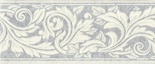 -. Title : Wallpaper Border Eggshell White Textured Acanthus Leaf Scroll on Silver Blue