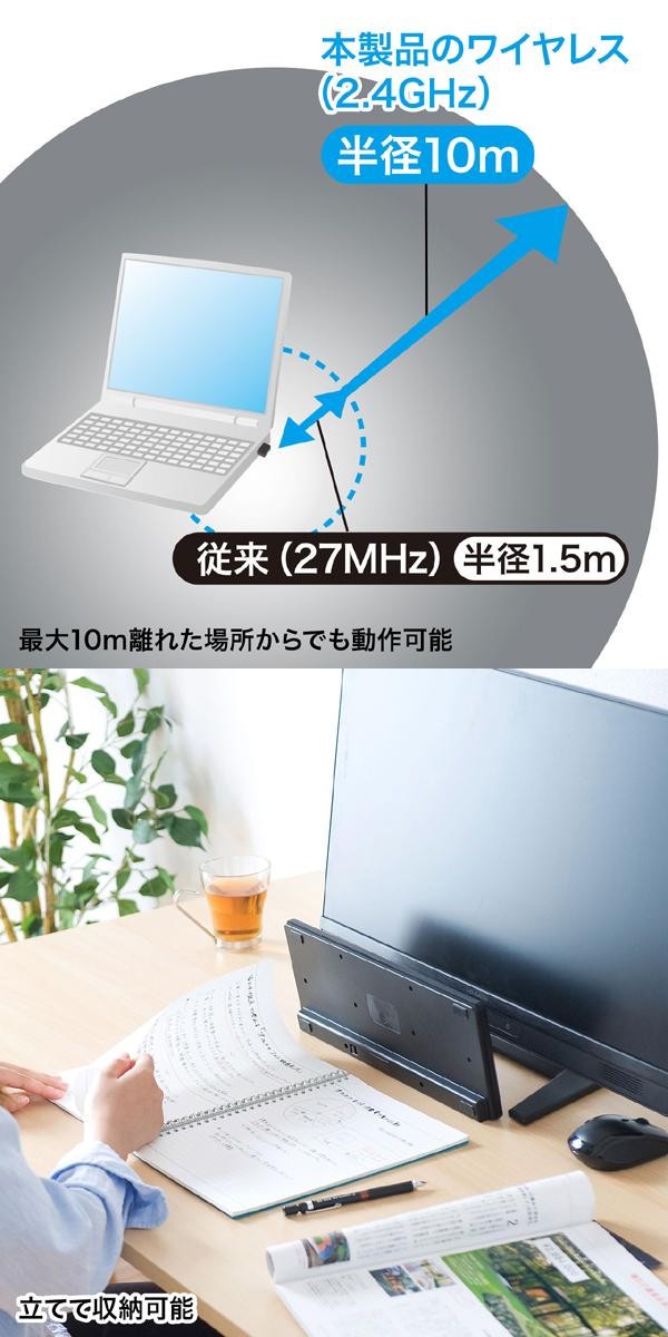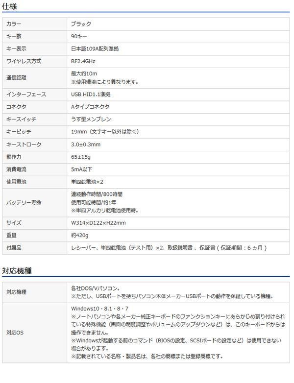 電波の到達距離の長い、周波数2.4GHzタイプで、最大10m離れた場所からでも動作可能です!隣合うキーを押しにくい「アイソレーション」タイプのキーボードで、誤入力を軽減します。テンキーなしの省スペース設計。 |