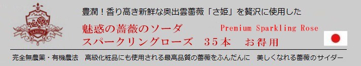 ![]() | ![]() 香り高きバラ さ姫30本分に相当するローズエキスを使用。通常のバラより極めて強いビロード似の鮮やかな紅色とゴージャスな甘く深い芳香が最大の特徴です。 独自に交配を重ね香りと色と花弁の肉厚をエレガントに改良しました。 うっとりするような上質な香りがほのかな炭酸と共に立ち上る、これぞ究極の美 真紅の薔薇サイダーです! ![]() |