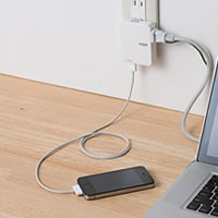 ???iPhone・iPodの充電と家庭用コンセントが同時に使えるタップ家庭用コンセントからiPhone・iPodが充電できるUSBポートに加え、家庭用コンセントの差込口を1個口装備したコンパクトな「USB充電機能付き電源タップ」です。電源タップ本体に家庭用コンセントの差込口があるので、PCなど家庭用コンセントを使用する機器を接続して使用することができます。1 ポートあたり1000mAの高出力で、安定した充電が可能です。