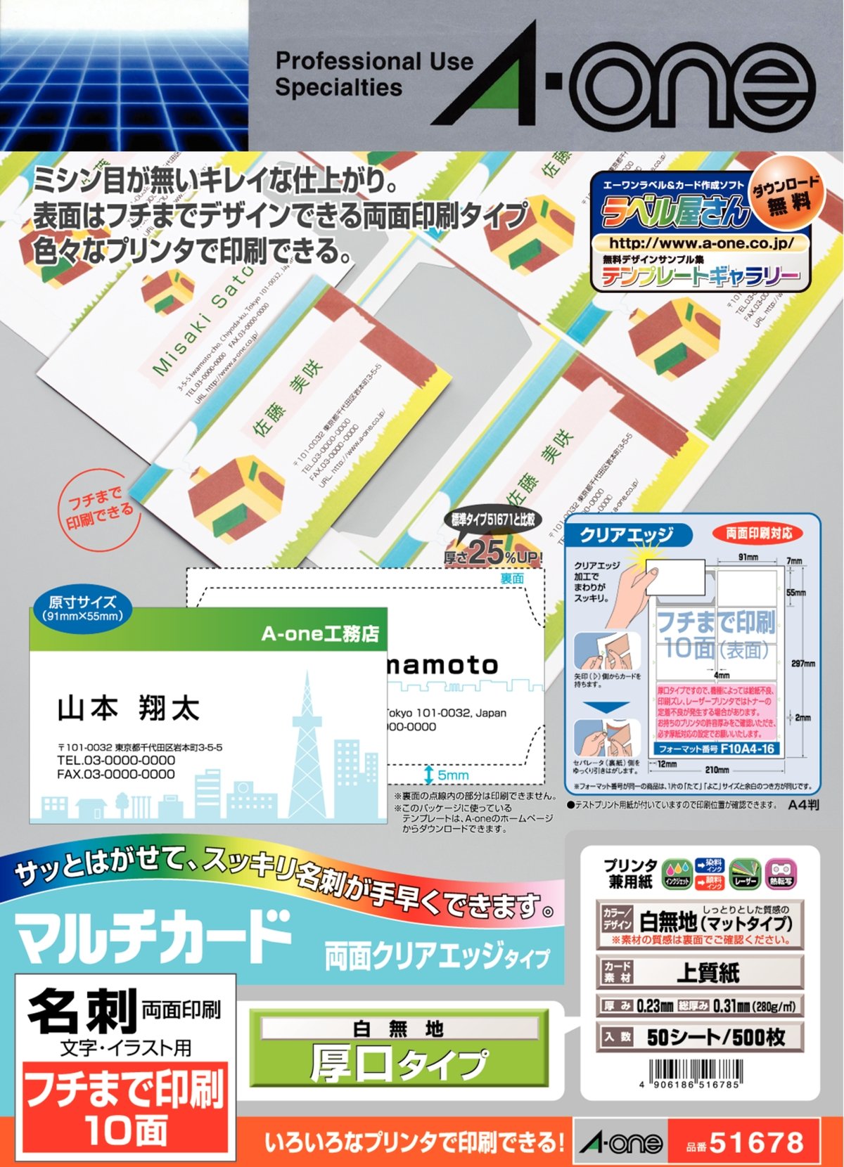 -One to (A-one) multi-card various printers and paper double-sided clear edge type Heavyweight plain white A4 size borderless printing 10 sided business card size 50 sheets (500 sheets) 51 678 (japan