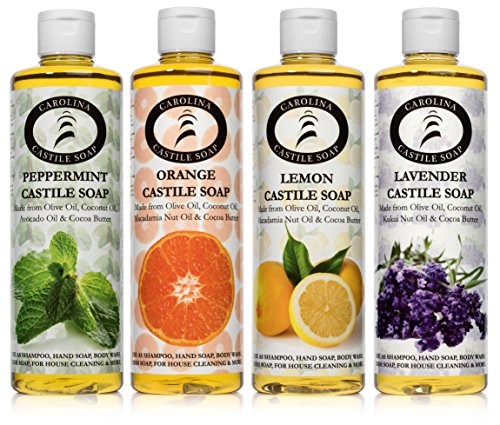 1 each of Lemon Castile Soap, Lavender Castile Soap, Peppermint Castile Soap, & Orange Castile Soap Made from Organic Olive Oil, Organic Coconut Oil, Kukui Nut Oil, and Fair Trade Organic Cocoa Butter. Great for use as a body wash, shampoo, shaving soap, dish soap, house cleaning, and laundry soap. More skin loving Olive Oil content than any other major Castile Soap brand.Feature