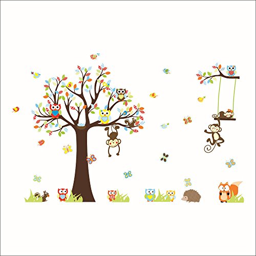 Rainbow Fox Kids Wall Decal , Jungle Zoo Theme Colorful Owl Monkey Tree Decorative Nursery Wall Sticker for Children Bedroom, Nursery, Playroom Wall Mural